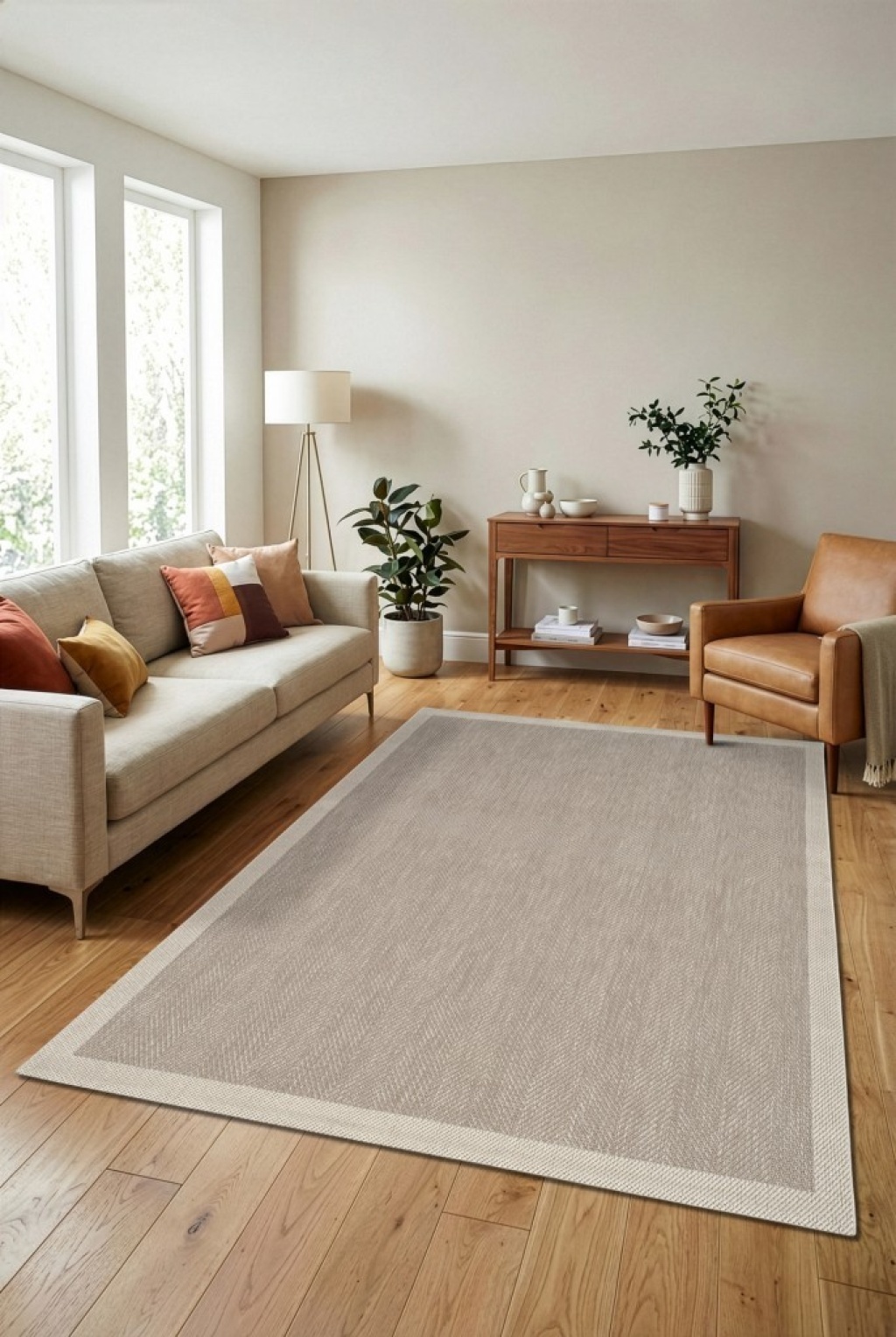 Çerçeveli Bohem Dokunuşlu Doğal Tonlarda Modern Sisal Krem Bej Renk Halı