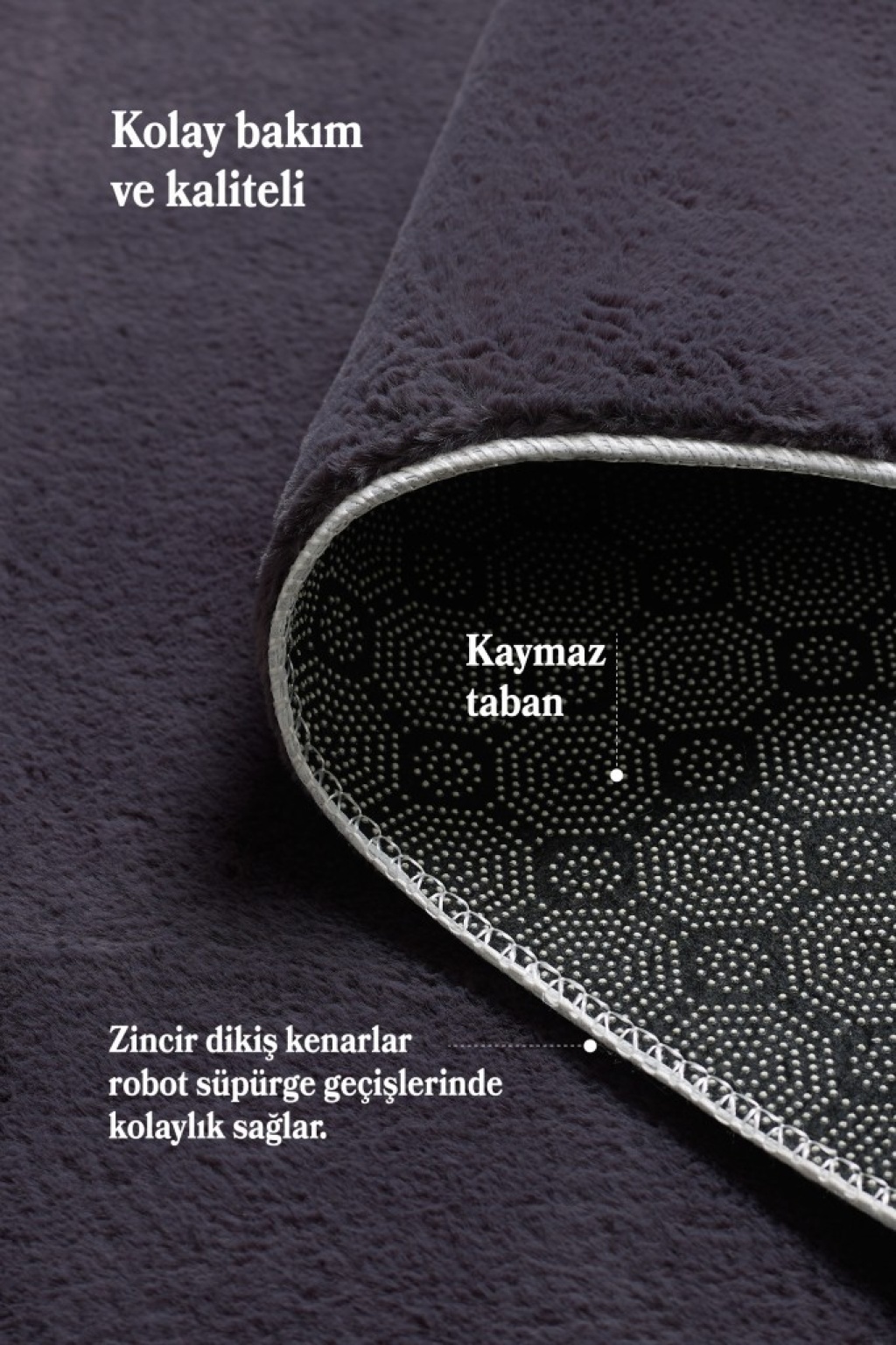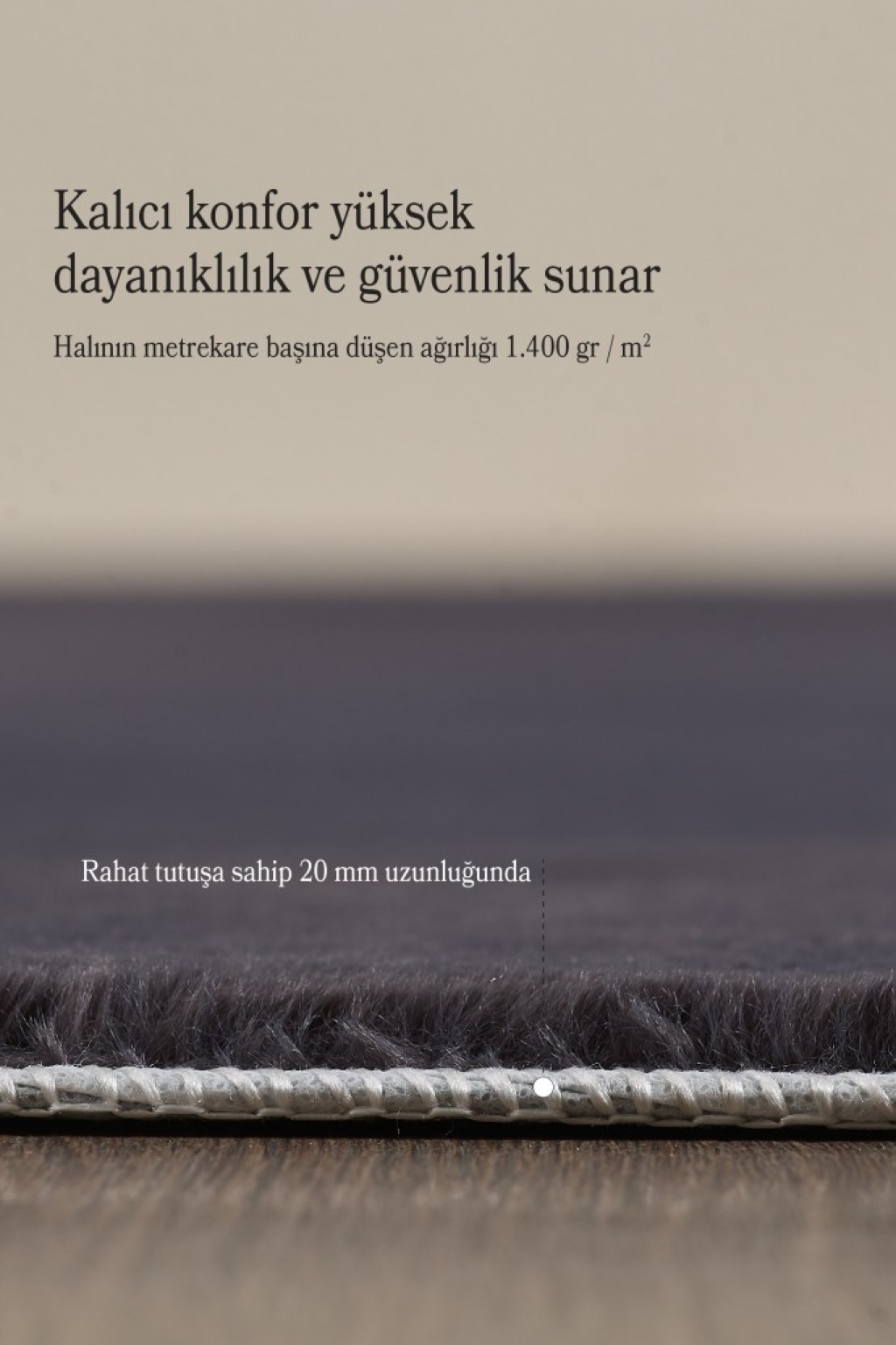 Ultra Yumuşak Tavşan Tüyü Doku: 20 mm hav yüksekliği sayesinde ekstra yumuşak ve konforlu bir yüzey sunar. Ayak bastığınız anda rahatlığı hissedersiniz. Yoğun ve Kaliteli Malzeme (1400 gr/m²): Yoğun gramajı ile hem dolgun bir görünüm sağlar hem de uzun ömürlü kullanım sunar. Kolay yıpranmaz. Kaymaz Taban: Özel kaymaz tabanı ile halı zemine sıkıca tutunur. Kayma ve kıvrılma yapmaz. Çocuklu evler ve evcil hayvanlar için güvenlidir. Yıkanabilir & Kolay Temizlenebilir: Makinede yıkanabilir yapısı ile hijyen sağlar. Ayrıca günlük kullanımda ıslak mendil ile kolayca silinerek temiz tutulabilir. Pratik temizlik için idealdir. Antialerjik Özellik: Toz tutmayan ve alerji yapmayan yapısı sayesinde hassas bünyeler için uygundur. Sağlıklı ve konforlu kullanım sunar. Modern ve Şık Tasarım: Zamansız tasarımı ile modern ya da klasik tüm dekorasyonlara kolayca uyum sağlar. Evinizin atmosferini yeniler. 5 Farklı Renk Seçeneği: Evinizin stiline uygun renk alternatifleri ile dilediğiniz uyumu yakalayabilirsiniz. Renkler canlı ve kalıcıdır. Geniş Kullanım Alanı: Oturma odası, yatak odası, çocuk odası, antre ve daha birçok alanda rahatlıkla kullanılabilir. Pratik ve Estetik: Şıklık, fonksiyonellik ve temizlik kolaylığını bir araya getiren bu halı, evinizin her köşesinde fark yaratır.