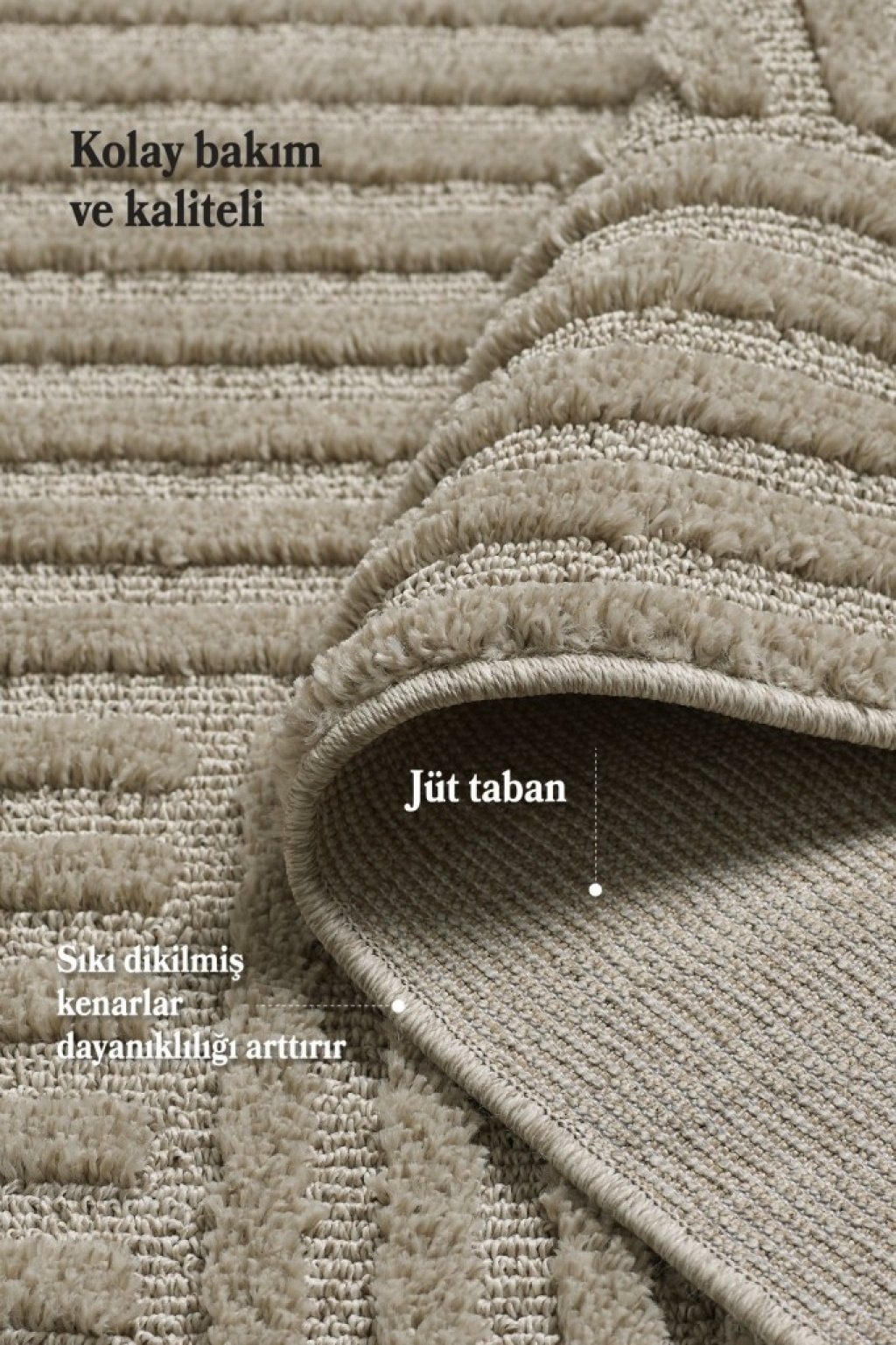 •  Taban: Jüt taban – Doğal malzeme, zemine iyi tutunur, kaymaz ve koku yapmaz.