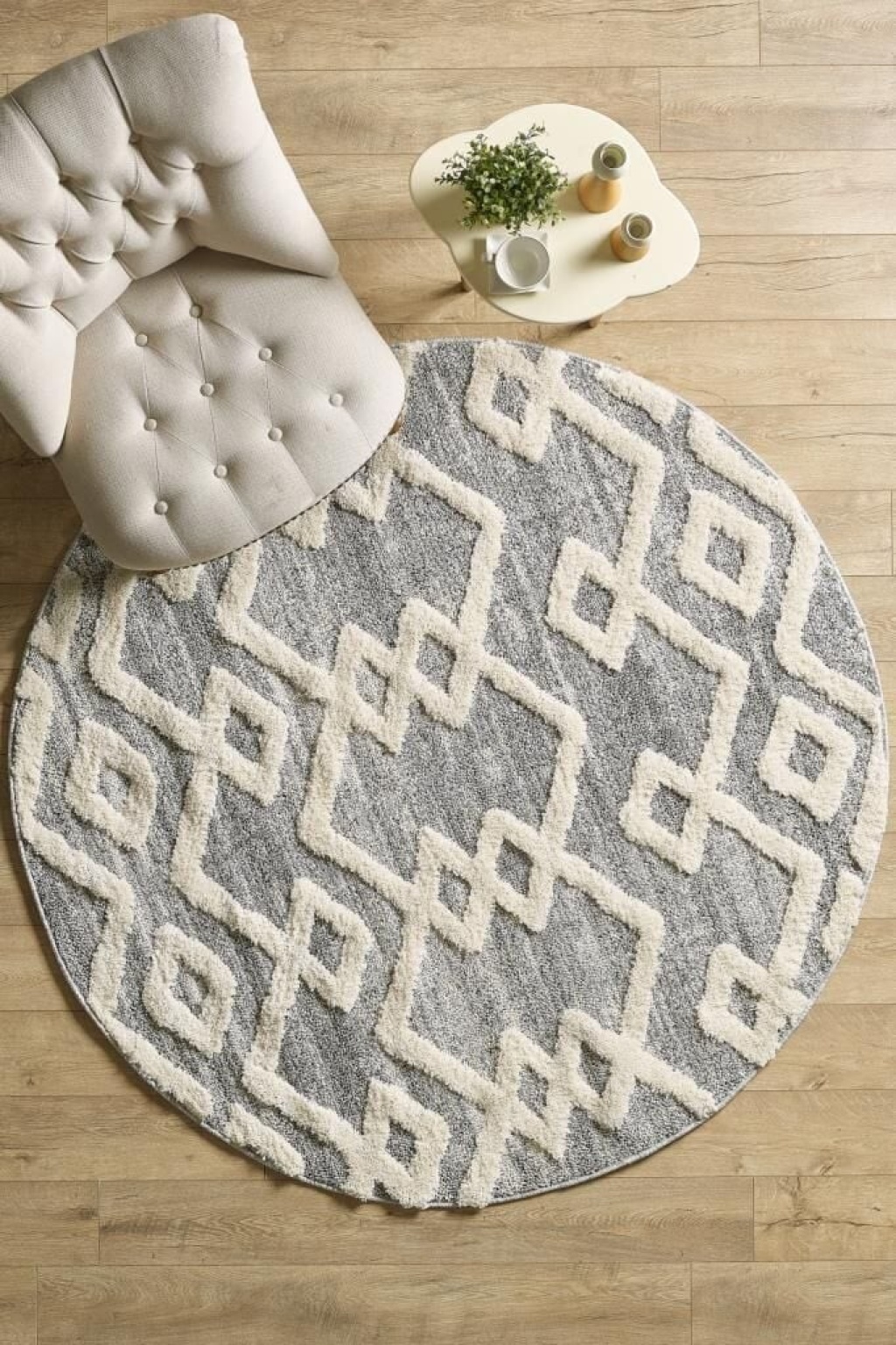Yuvarlak Halı Yumuşak Bukle Tabanlı Modern Kabartmalı 3D INKA Motif Desenli Krem Gri Renkli Halı